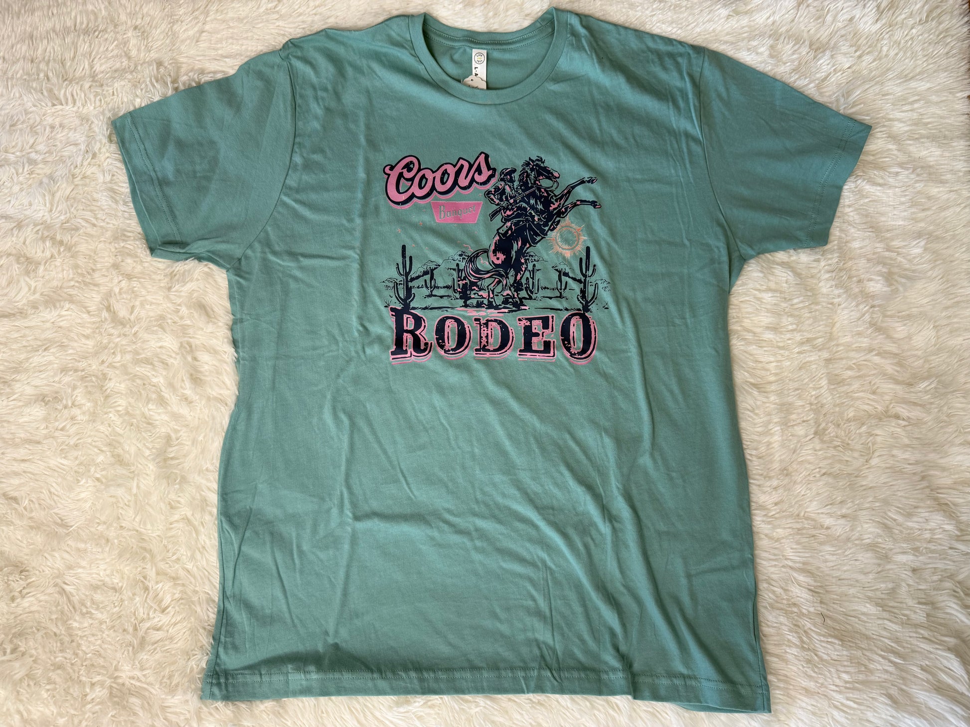 Saddle up in style with this turquoise Coors Rodeo graphic tee — a perfect blend of western grit and retro charm. The front features a bold bucking bronc scene with desert cacti and sunset accents, all topped with that classic rodeo lettering in pink and black for a pop of color.